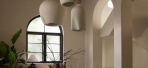 素白拱门框景,将光线与建筑结构编织成画,粗粝纹理的吊灯悬于上空 ...