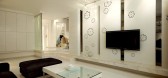 客厅装饰采用简洁,装饰画以写意为理想,泼墨为主题,用墨的干净和收放在诠释以静制动的东方精髓,演绎成空间的妙笔;茶室榻榻米上粗糙的麻质布料地毯;主卧的设计亦简约,依然用毛笔与宣纸诠释水墨画的写意;房间中...