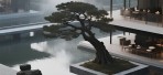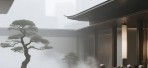 朦胧的城市天际线在巨大落地窗外氤氲成抽象背景画,脚下温润石砖诉说着古老与现代的对话。冷峻的金属线条悄然融入,与传统东方建筑神韵碰撞,激荡出充满未来感的静谧诗意。