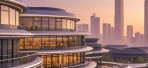 朦胧的城市天际线在巨大落地窗外氤氲成抽象背景画,脚下温润石砖诉说着古老与现代的对话。冷峻的金属线条悄然融入,与传统东方建筑神韵碰撞,激荡出充满未来感的静谧诗意。