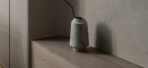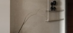 玄关以灰石地坪揭开序章。波浪形木凳悬浮於地,石材花器盛着乾枝,影落涂料微纹之上,静而不空,为归家铺一缕从容。