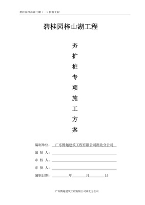 碧桂园梓山湖二期(一)桩基工程碧桂园梓山湖工程扩桩专序项施工方案编制单位:广东腾越建筑工程有限公司湖北分公司编制人:审核人:审批人:编制日期:年月日广东腾越建筑工程有限公司湖北分公司碧桂园梓山湖二期(一)桩基工程目录一、工程概况及设计要求二、施工工艺及设备造型配套2(一)施工工艺流程(二)设备选型配套2(三)施工现场布置.3三、施工顺序及进度.…四、组织机构和岗位职责3(一)组织机构及岗位职责.3(二)现场施工组织管理,.4五、施工工艺技术要求(一)施工现场准备.(二)钢筋笼制作与吊装.5(三)砼配制与灌注砼.6六、施工质量标准及质量保证措施(一)施工质量标准>(二)质量保证措施.七、安全生产….9(一)安全生产(二)场容管理