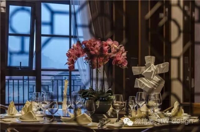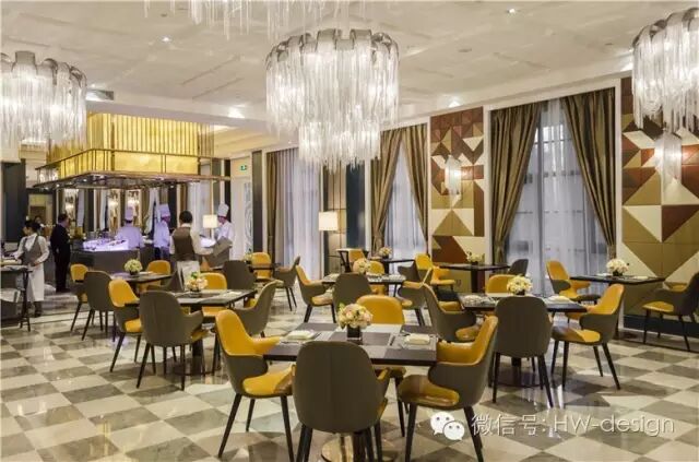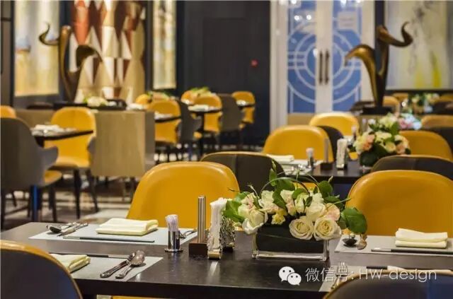 全日餐廳傢俱以棕色為主,黑色與金色為輔色,完美的結合硬裝給空間注入沉穩又不失時尚的色調;配飾以純凈的白色、高貴的金色、時尚的銀灰色及鮮嫩的綠色為空間點綴色;整個空間格調鮮明。