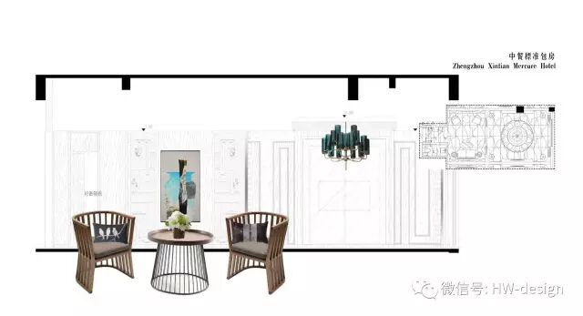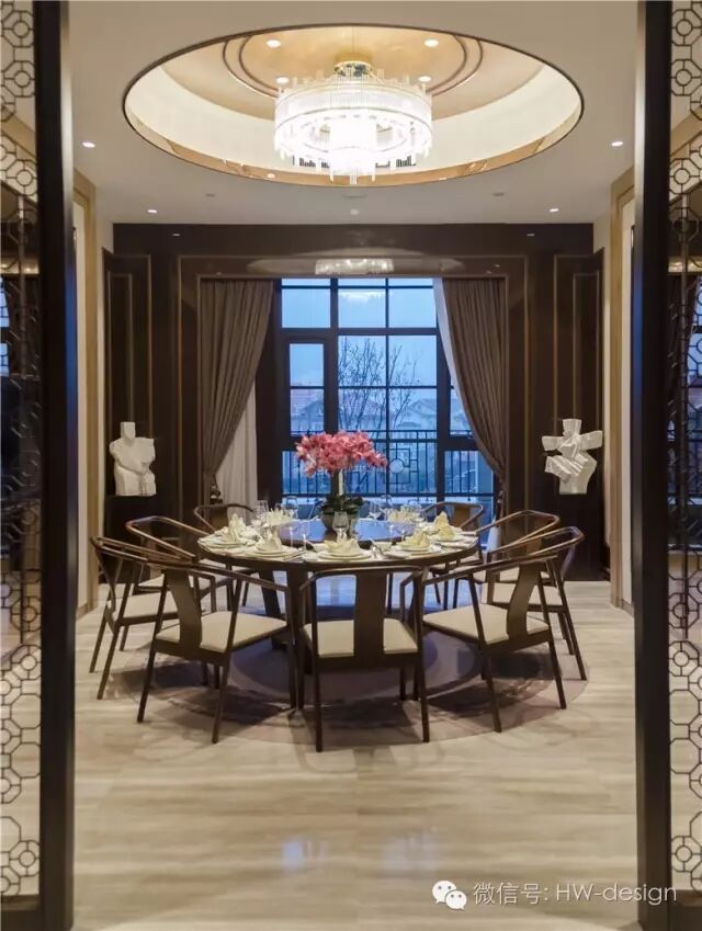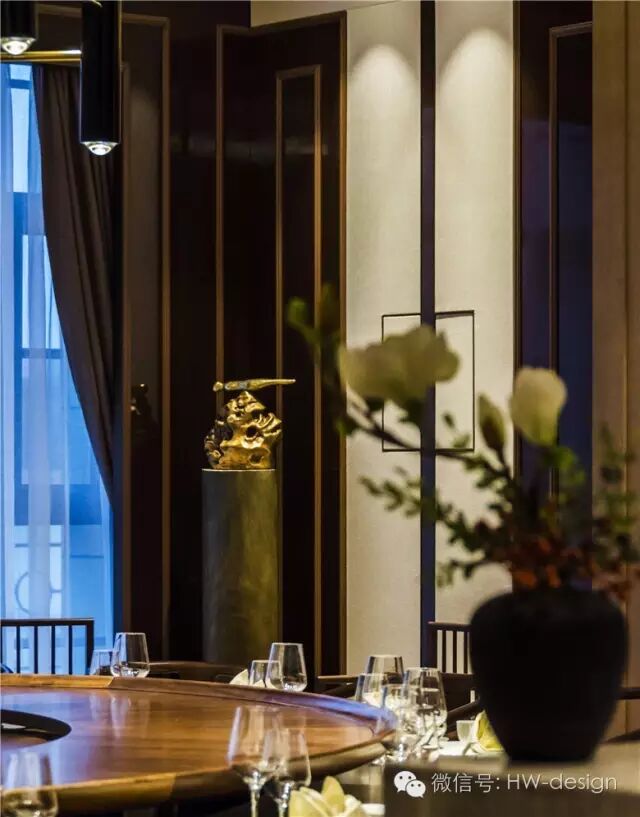 中餐廳豪華包房傢俱以沉穩大氣的深咖色為主色,黑色和米灰色為輔色;窗簾及掛畫使用暖黃色為輔色,裝飾落地雲卷舒擺件高貴金為主色,局部空間配飾以春意盎然的嫩绿,純凈的天空藍及中國紅加以点缀,整个空間以禪意大氣的格調映入眼簾。