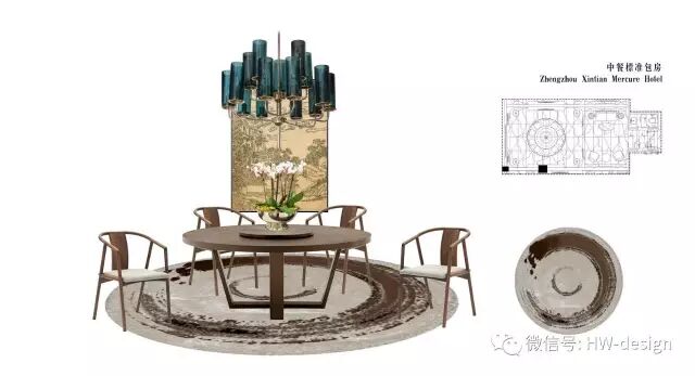 中餐廳標準包房傢俱以沉穩自然的原木色為主色,黑色和米灰色為輔色;燈具以典雅藍為主色;窗簾及掛畫使用暖黃色為輔色,裝飾禪意擺件以純凈白為主色,局部空間配飾以高貴的金色和春意盎然的嫩绿及枣红色加以点缀,整个空間追求禪意美的同時也滿足色彩帶來的舒適感。