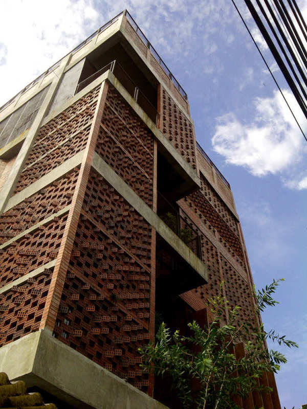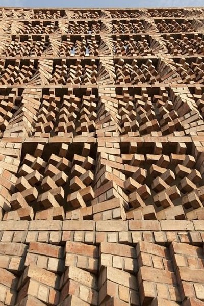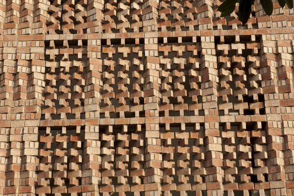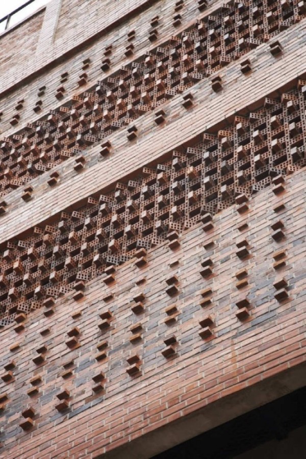 这个位于新德里的南亚人权文献中心的新办公楼成为一个不同寻常的,富有灵性的建筑。建筑师Valbhav Dimri和Madhav Raman在他们50平方米的办公室中,利用有限的预算,设计出了这个有效利用空间并结省成本的办公大楼。 在设计过程中,两位设计师觉得在工作区域屏蔽噪音和来自街道的视觉干扰以及阳光直射是十分必要的。 建筑师们通过沿着建筑物较长的侧墙铺砌了由富有抽象艺术效果的外墙砖组成的设计复杂的墙,从而实现了这一设想。 建筑师们受到传统建筑的启发,设计了一种具有复杂视觉效果的单一重复砖墙模式。这种模式源于拥有悠久历史的印度传统建筑jalis (brise soleil) 的精美的雕塑风格。 通过铺设230mm×15mm×75mm(印度标准砖尺寸)面砖从而实现了这一设计。复杂正墙的安装则是五周学习再学习并结合了当场技术实践的成果。