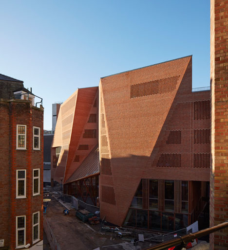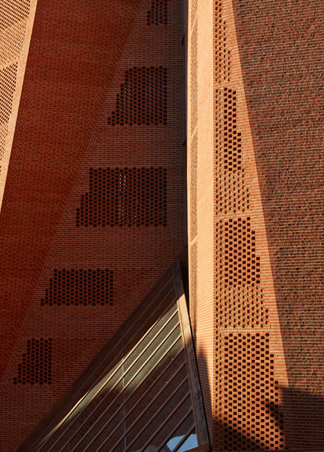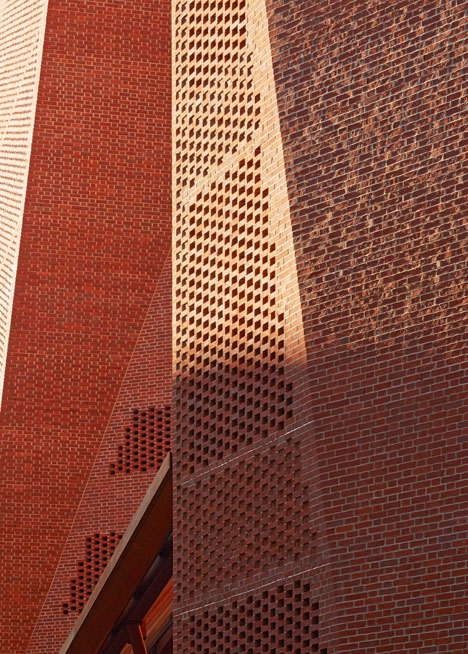 爱尔兰事务所两位建筑师Sheila O'Donnell和John Tuomey对伦敦政治经济学院校园沿街的学生中心做了全新的设计,焕然一新的红色砖墙不规则的块面与周边成不同的角度,与周边环境形成独特的几何关系。 建筑师说:“红砖墙体的构建是典型的梅花砌砖法(flemish bond),有些部位形成实墙,在窗户的部位形成带孔的幕墙。”这种用梅花砖砌法形成的带孔的墙面,既能让光线渗透进室内,在晚上还能将光线滤出去,产生图案的效果来。 董豫赣建筑师北京红砖美术馆设计