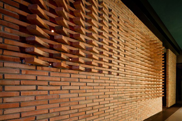 由Studiomake设计的曼谷酒吧,渐变旋转角度的红砖墙形成了渐变的通透效果。