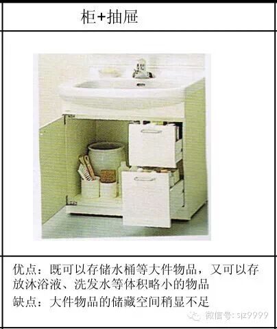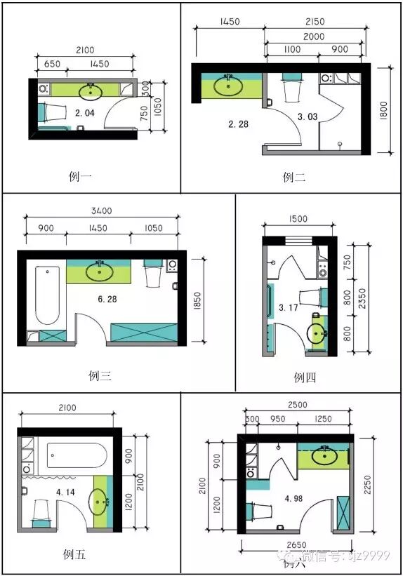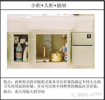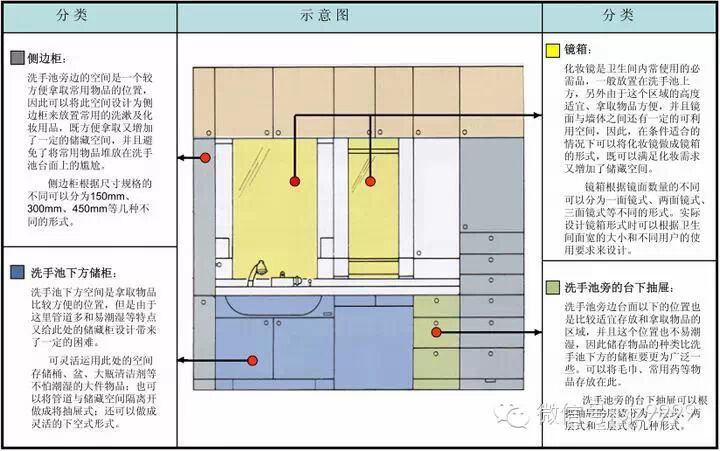 下图分析标识了六种典型卫生间布置形式下的储藏空间位置形式。