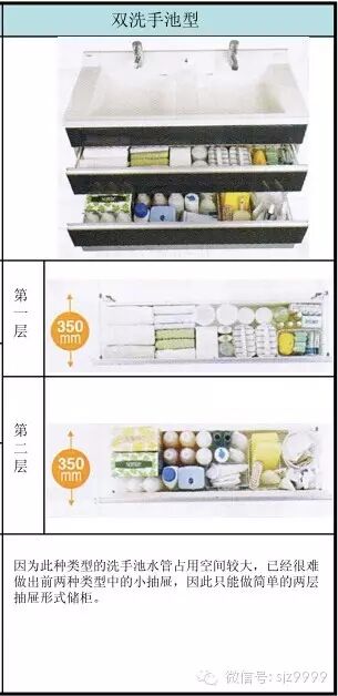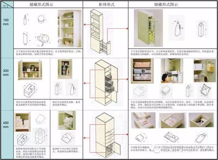 卫生间内储柜形式根据储藏位置的不同可以分为侧边柜、洗手池下方储柜、镜箱、洗手池旁边台面下的抽屉等几种不同形式。根据人机工效学中的要求和使用舒适度的考虑,在此将不同形式的储柜做了较为详细的物品储藏分配图。