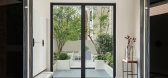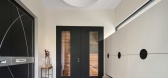 女主人的书房以现代设计手法融合中式意蕴,黑色蝴蝶翼形书桌拥有利落的几何切割,硬朗质感并存。整面墙的书架大气有序,兼具收纳和展示功能。