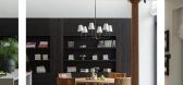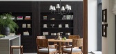 餐厅以简单色调勾勒出空间层次与复古调性。墙面置物架丰富了空间的趣味表达。