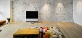 木皮板、鐵件、橡木仿古木地板、小彫刻白&藍木紋石材、烤漆玻璃