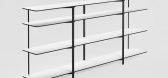 ...些作品的特点是黑白色调色板,目前由一个架子,吊灯,低矮的桌子,椅子和衣柜组成。搁置系统是模块化的,允许许多不同的配置和使用。