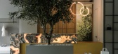 ,“客厅里的主要特色是玛丽亚·戈尔布诺娃 (Maria Gorbunova) 双手的大型作品。 旁边是一个酒柜和一张 The Ply 的混凝土桌子。...