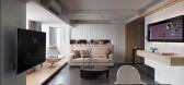 电视背景墙使用了一整块木饰面加上有规律的分缝,与进入主卧的隐形门形成一个整体,同时也留有适当储物的空间;使用了深色的木饰面,沙发背景墙设计师就采用了浅色搭配上少许的石膏线条,简单...