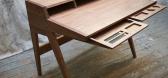 ...书桌是一款非常独特的作品。它简单、实用、现代--让人回想起昨天实用的写字台的简单和工艺。它的许多功能包括桌面后端的三个打开的小方块,它隐藏了两个脐带端口,但令人惊叹的似乎是两个角度的抽屉,当它被拉出来时...