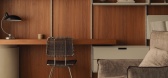 ...床背景的饰面板以温暖的木色包围着清冷的深灰用墙体的圆弧柔和格栅的硬朗