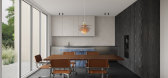 Open Studio利用切割的大理石设计了一张朴实无华的餐桌,以赞美其自然之美,包括石边和缝隙。