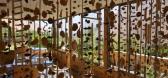 置身宽阔的板前区,倾斜而上的巨大天顶把人的视线自然而然往上引,充满刚劲的力量感的线条,通过各种排列组合和设计规划,分布在天顶的细节之中,宛如刀光剑影的装置悬于空中。