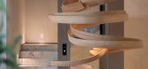 两侧床头柜,呈现方中有圆、圆中有方的组合形态,配合轻盈、神秘气质的画作,让一抹优雅回荡其间。