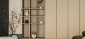 ...侧沿墙铺展的挂放区与悬浮柜体一气呵成,从玄关延绵至客厅,以原木的温润串联起功能与形式。至此,原本局促的入口,在材质的包裹与体块的悬挑中,化为归家时第一道舒展的序章。
