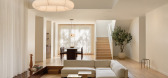纯白色基调让高达6米的挑空客厅显得更加明亮宽敞,巨型背景墙上的格栅和波浪造型简洁而灵动,原木色的窗框、饰面点缀其...