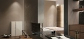 乌克兰这间 12 坪大的楼中楼小宅中,FORM bureau 設計团队将卧房规划在二楼区域,使得一楼的开放式客餐厨空间扩大,全室以大地色系做为空间基调,并利用天然建材砌筑。