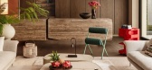 盒型结构的下方,一处精巧的mini吧填补空间留白。洞石吧台构建洄游式动线,其上的天然纹路搭配流动感造型,更加强...