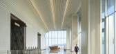 通过墙面与吊顶的一体化弧形构造,让建筑外部的曲线在室内无缝延续。层叠式的吊顶系统,将灯光、风口等机电设备精心隐藏,仅留下柔和洗墙光晕...