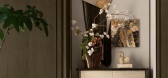 茶室以多扇折叠木质屏风巧妙区隔空间,镂空纹样暗合东方园林虚实相生之妙,既守得一方静谧天地,又让光影与绿意自由穿梭,视线在若隐若现间流转。茶室背景墙,香云纱艺术挂...