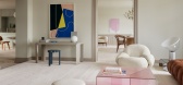在卧室空间中,实心胡桃木半高墙板包裹着整个空间,同时墙面展示着与台湾艺术家/木作匠人Moofoo合作的墙面艺术品。主卧室卫浴里,一...