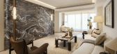空间气质凝练简净,深色质地与大理石肌理、柔软布艺相得益彰,展演色...