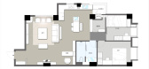 业主喜欢新中式,喜欢品茶,要求把阳台做成露台花园,主卧卫生间改衣帽间,厨房和生活阳台的墙打通,留两个卧室,客房做成茶室,还要摆放架子鼓。