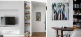 门厅处是整个格局改动最大的位置,原始墙体拆除后以PU仿石结合不锈钢钢板做了半隔半透的玄关背景墙,深色岩石的质感极强,钢板搁架使客厅和书房的视角若隐若现,让人一进门便想一探究竟。客厅最大的亮点是长9...