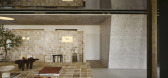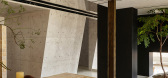 室内我们选用三个材料来实现:莱姆石小块拼接、墙地面的浅色涂料和中部区域的黑色木饰面,它们作为一条主线来定义和划分每个空间。
