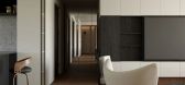 ...廳,并穿过一个开放和豪华的走廊。在大理石板的末端,木质效果板接管,创建其余墙壁、场景空间门和存储解决方案的一致性。其他存储体隐藏在纹理丰富的玻璃门后面,包括两个步入式壁橱,以及一个定制的书架,大胆地站...