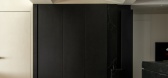 在设计上删繁就简,黑色电视背景墙结合暗门,有藏有露。结合色彩、材质的搭配、尺...