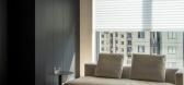 打散原有空间的桎梏,原四房变动为三房,划分一书房,玻璃门後错落於琴库与收纳格之中的墨色设计,展现现代格调,另为墙面作氛围营造,可掷书本坐享阅读、午茶时光,亦可通过镜...
