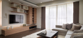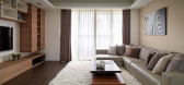 主卧延续了整体的风格统一设计,光线柔和地穿过窗帘,...