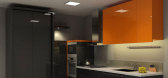 ...又非常精致和舒适。 要求是留下混凝土天花板并将墙壁漆黑。 同时室内不应该看起来很暗,所以使用了家具中的精致色彩。