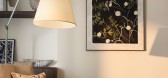 一幅碎花壁画将明亮的珊瑚色和绿色点缀在用餐区。浅灰色的现代餐椅和一张配套的桌子静静地坐在前景中。