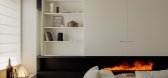 沙发背后的 2.4 米悬浮书桌,以 10cm 的高差轻巧划分场域,