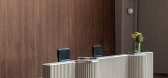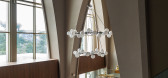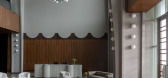 整个B1层的天花均模拟水波的形态,一圈圈,在功能空间凝成圆形的“涡”,又在会客区的上空聚为巨大的“水珠”垂坠而下,与壁炉相接、“水火交融”。
