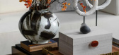 浅色大理石块面铺叙、古铜不锈钢细节勾勒,极度概括的造型透过界面借材质刻画细节肌理;装置孤悬,似披练轻...