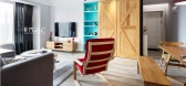 ...,通过这些元素的运用以及暖色调的材质与灯光,打造出纯朴而又时尚的空间。原木色的壁柜、仿旧的摆件、以及这张做旧的木材拼桌,无不流露出浓厚的自然气息,黑色的地毯则调节了空间的色彩,拉开层次。