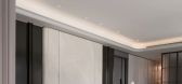...花板以淡褐色,交织出低彩度的平静氛围,轻触间传递出自然与工艺的平衡之美。 客厅电视墙,因应上方的大梁压迫,采用弧形天花设计,流畅的曲线巧妙消解了梁体的沉重感;以弧形书桌界定书房与客厅,自然曲线的延伸赋...