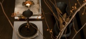 一层玄关内放置了一个大型的松树造型艺术装置,灯光照在上面,有些威严之气,寓意平安吉祥。