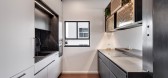 设计简单介绍:柜体内部分储物与厨房操作空间,门为隐框白色烤漆滑轨。墙面组成材料乳胶漆,白色窗...