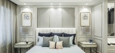 ...、帝皇金大理石、墙纸、皮革硬包、暗花地毯、金色不锈钢条、木质白色哑光喷漆面项目性质:样板间现场摄影:周俊文